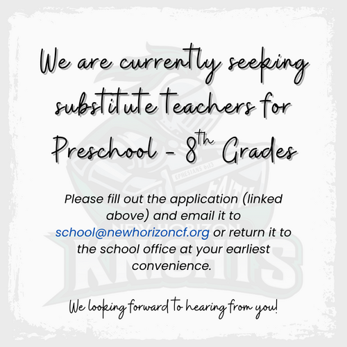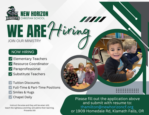 Working at New Horizon Christian School isn't just a job. It's a call to ministry. It's loving the Lord and living for Him in your personal life, while shepherding our younger brothers and sisters in Christ